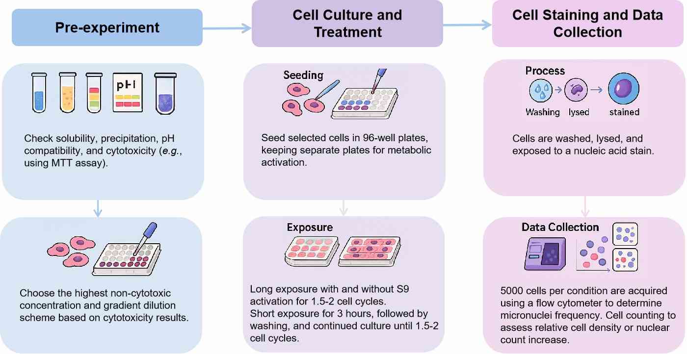 Genotoxicity is a core indicator in the safety assessment of drugs, chemicals, cosmetics, and industrial materials, directly related to potential carcinogenicity and mutagenic risks. Micronuclei are small nuclei separated from the main nuclei of cells, produced during telophase of mitosis or meiosis by lagging chromosome fragments or whole chromosomes, and not incorporated into a daughter nucleus. Thus, the presence of micronuclei indicates genotoxicity and chromosomal instability.