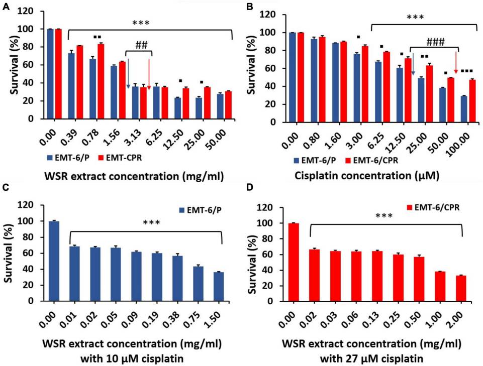 Fig. 2. Antiproliferative effect of WSR extract, cisplatin, and their combination against EMT6/P and EMT6/CPR cell lines (Jawarneh S, Talib WH, et al., 2022).