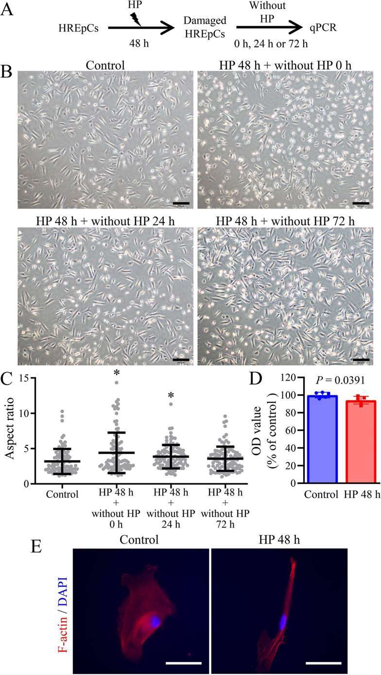 After treating HREpC with HP for 48 hours, the cell morphology showed that some HREpC became rounded (Fig. 3A and B). The cell aspect ratio increased but returned to baseline levels within 72 hours after removing HP treatment, indicating that the elongation of HP-treated cells was reversible (Fig. 3C). MTT assay showed a slight decrease in cell viability in HP-treated cells compared to control cells (Fig. 3D). Furthermore, F-actin in HP-treated cells exhibited an elongated morphology (Fig. 3E). The growth factor expression results indicated that the expression of CSF2 and VEGFB was decreased in HP-treated cells after HP removal. The expression of TGFB2 and PDGFB decreased after long-term HP treatment and subsequent removal. Meanwhile, TGFB3 expression increased in HP-treated cells after HP removal. The expression of VEGFA decreased in HP-treated cells 72 hours after HP removal (Fig. 4).