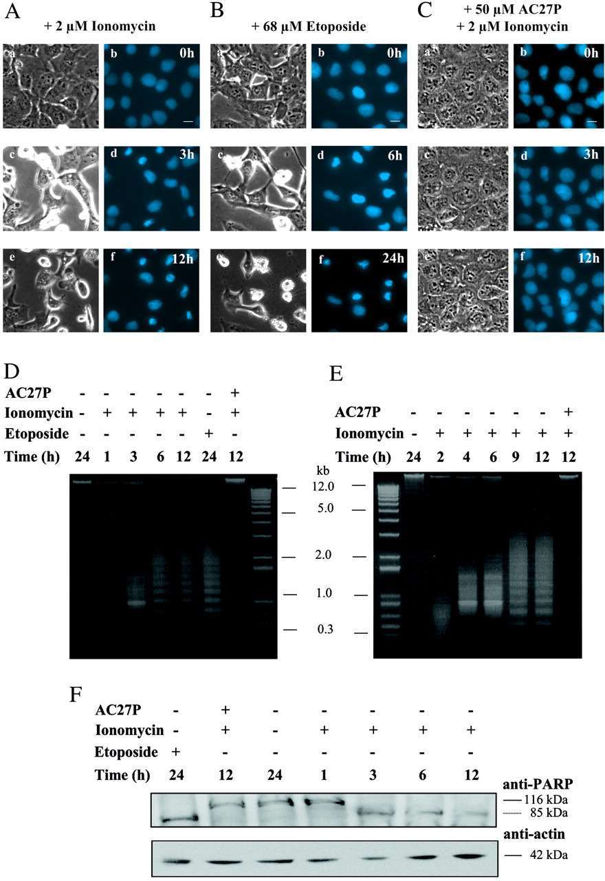The addition of 2 μm ionomycin to LCLC-103H cells caused an instantaneous increase in intracellular Ca2+ concentration from 50 to 180 nm (Fig. 2D). Remarkably, calcium concentrations were raised transiently to 0.8-1.5 μm. Concomitantly, calpains were activated, as reflected by almost a double increase of Suc-LLVY-amc cleavage inhibited by AC27P (Fig. 2E). In addition, nuclear condensation was detected in the histone-ECFP-labeled cells 3 h after addition of ionomycin (Fig. 3A), and it was inhibited by preincubation with AC27P (Fig. 3C). DNA and protein analysis in ionomycin-treated cultures revealed DNA fragmentation (Fig. 3D) and PARP cleavage to an 85-kDa fragment typical of caspase-mediated apoptosis (Fig. 3F). The same observations were made in etoposide-treated LCLC-103H cells (Fig. 3B) and COS 7 cells after ionomycin addition (Fig. 3E), suggesting an apoptotic process, although its onset was delayed in comparison to ionomycin-treated LCLC-103H cells. These findings demonstrate that ionomycin induces apoptosis in these cells in a calpain-dependent manner.