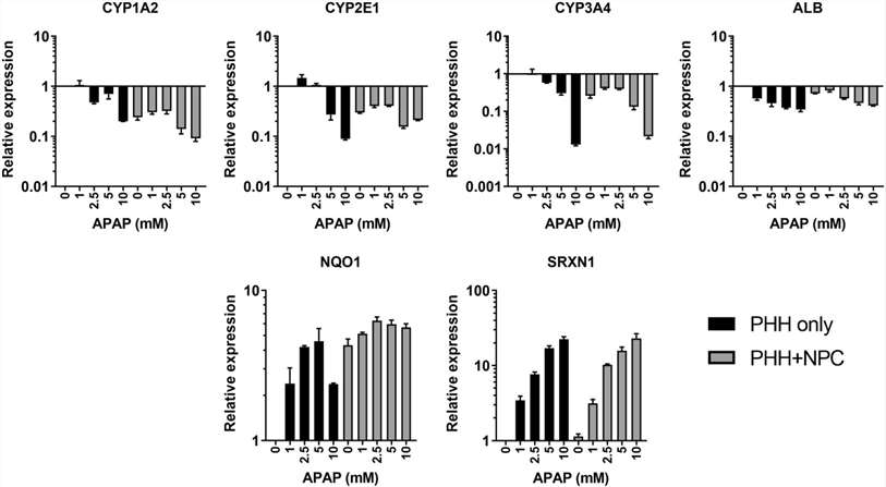 Spheroids were treated with the model hepatotoxicant acetaminophen (APAP) and the response was measured using various readouts. NPCs provided protection against APAP-induced toxicity, requiring higher concentrations of APAP to reduce cellular ATP levels (Fig. 1a and b). Sensitivity differences became noticeable after 24/72 hours of treatment and increased threefold after 14 days. Additionally, cellular glutathione depletion was greater in hepatocyte-only spheroids, suggesting higher sensitivity to APAP-induced oxidative stress (Fig. 1b and e). The hepatotoxicity of APAP is linked to the formation of the reactive metabolite NAPQI (N-acetyl-p-ben-zoquinone). LC-MS/MS analysis showed that Mono- and co-culture produced similar amounts of glucuronide and sulfate metabolites, but less APAP-GSH conjugate was detected in NPC-containing spheroids. Even though both types of spheroids had the same number of hepatocytes, NPC-containing spheroids showed lower expression of APAP-metabolizing enzymes (Fig. 1d). To determine if the difference was due to varying expression of enzymes involved in APAP metabolism, mRNA levels of CYP1A2, 2E1, and 3A4 were examined. These enzymes were lower in NPC-containing spheroids despite similar albumin levels. APAP treatment further reduced these enzymes, especially in PHH spheroids where their initial levels were higher. Nrf-2 target genes Nqol and Srxnl were upregulated by APAP in both models, suggesting that oxidative stress was induced in both models (Fig. 2).