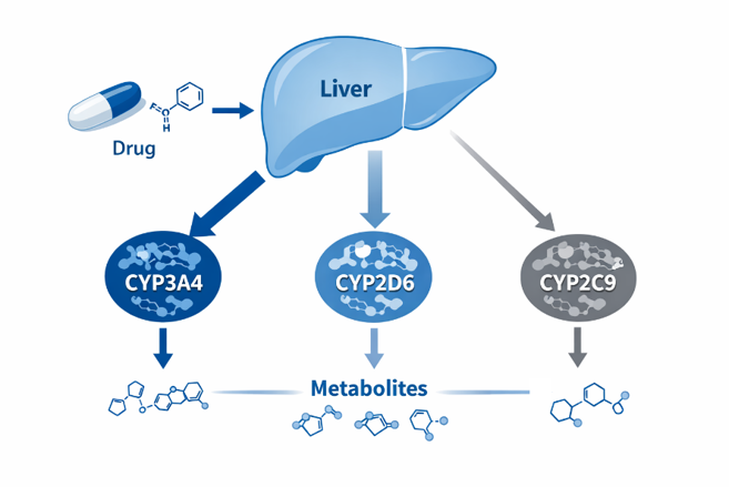 Most drug candidates are metabolized by multiple CYP enzymes, rather than a single pathway. Identifying which enzyme(s) contribute most to a compound's clearance is therefore essential. If a major metabolizing enzyme is inhibited or induced by a co-administered drug, plasma exposure may change substantially, leading to reduced efficacy or increased toxicity.