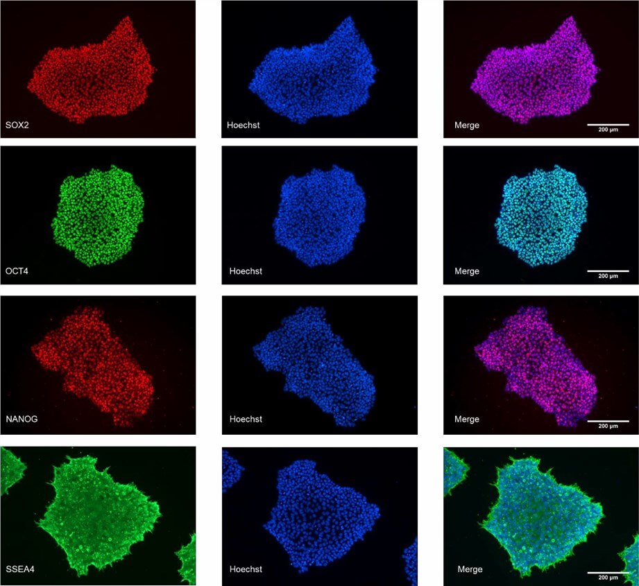 Positive expression of OCT4, SOX2, NANOG, and SSEA4 confirms pluripotent identity.