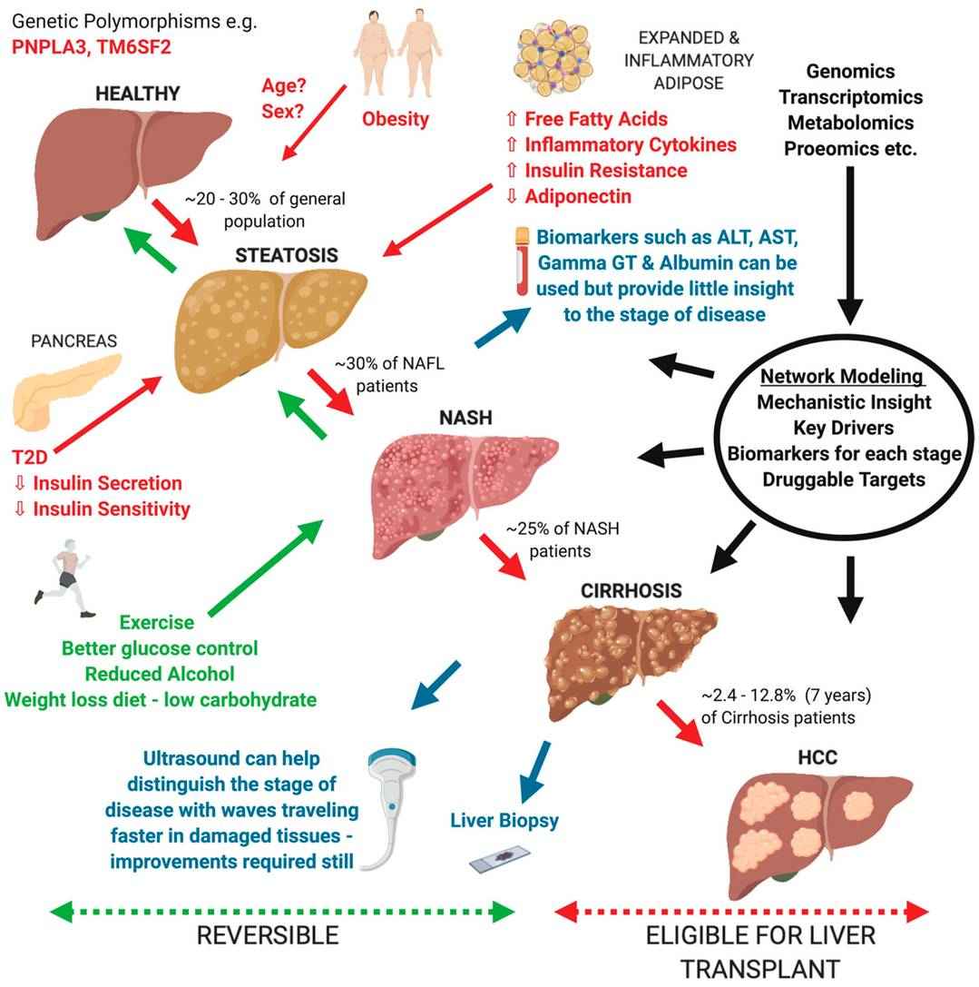 Fig. 1. Overview of current understanding of Non-alcoholic fatty liver disease (NAFLD) progression from a healthy liver to hepatocellular carcinoma (HCC) (Blencowe M, Karunanayake T., et al., 2019).