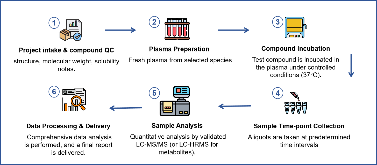 We offer a scalable plasma stability testing service with flexible throughput — from single-compound bespoke studies to high-throughput screening panels across multiple species. Data are generated by quantitative LC-MS/MS and reported as percent remaining over time and calculated in vitro half-life (t½) under defined conditions.