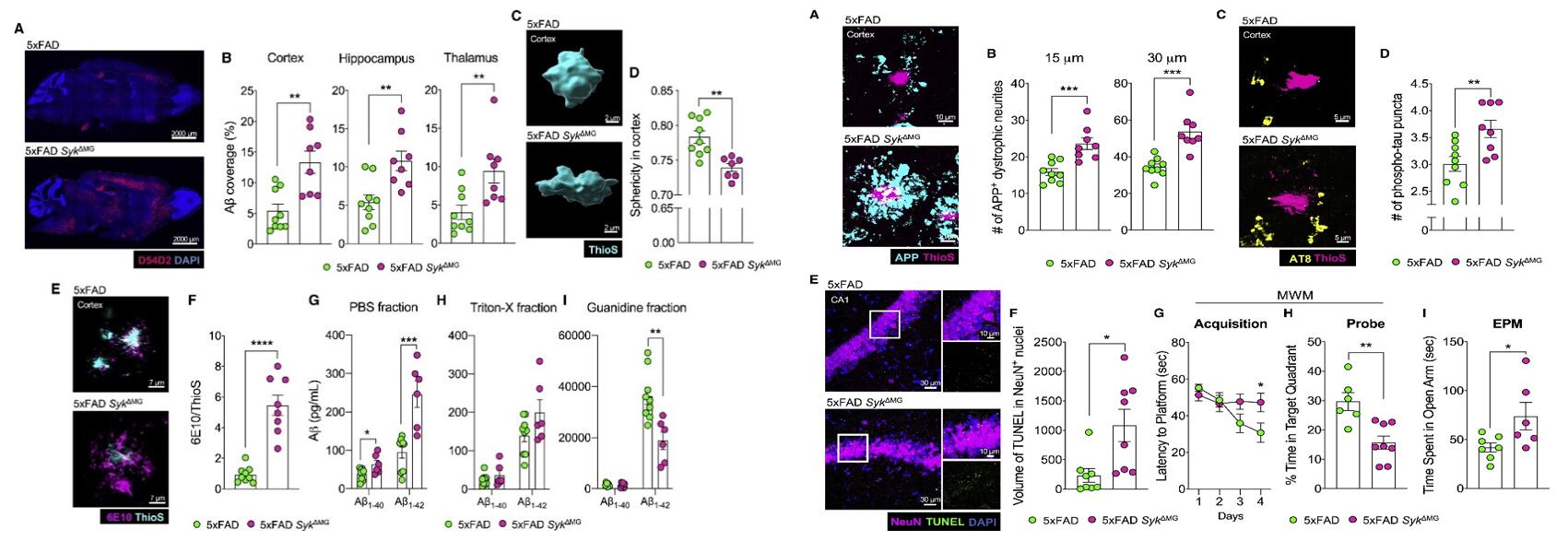 - SYK-deletion in 5xFAD SykΔMG mice leads to significantly elevated accumulation of Aβ in the cortex, hippocampus, and thalamus at 5 months of age; Aβ plaques in the cortex and hippocampus of 5xFAD SykΔMG mice exhibited lower sphericity than the plaques found in 5xFAD littermate controls. Altogether, these findings indicate that SYK is critical for Aβ consolidation and plaque compaction by microglia in 5xFAD mice.